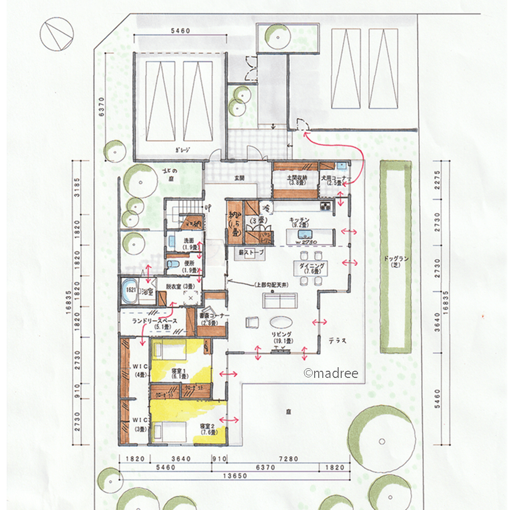 ・北側には玄関や浴室から眺める庭、南側には犬が自由に走り回れるドッグランを設けました。LDKと繋げてBBQなども楽しめます。
