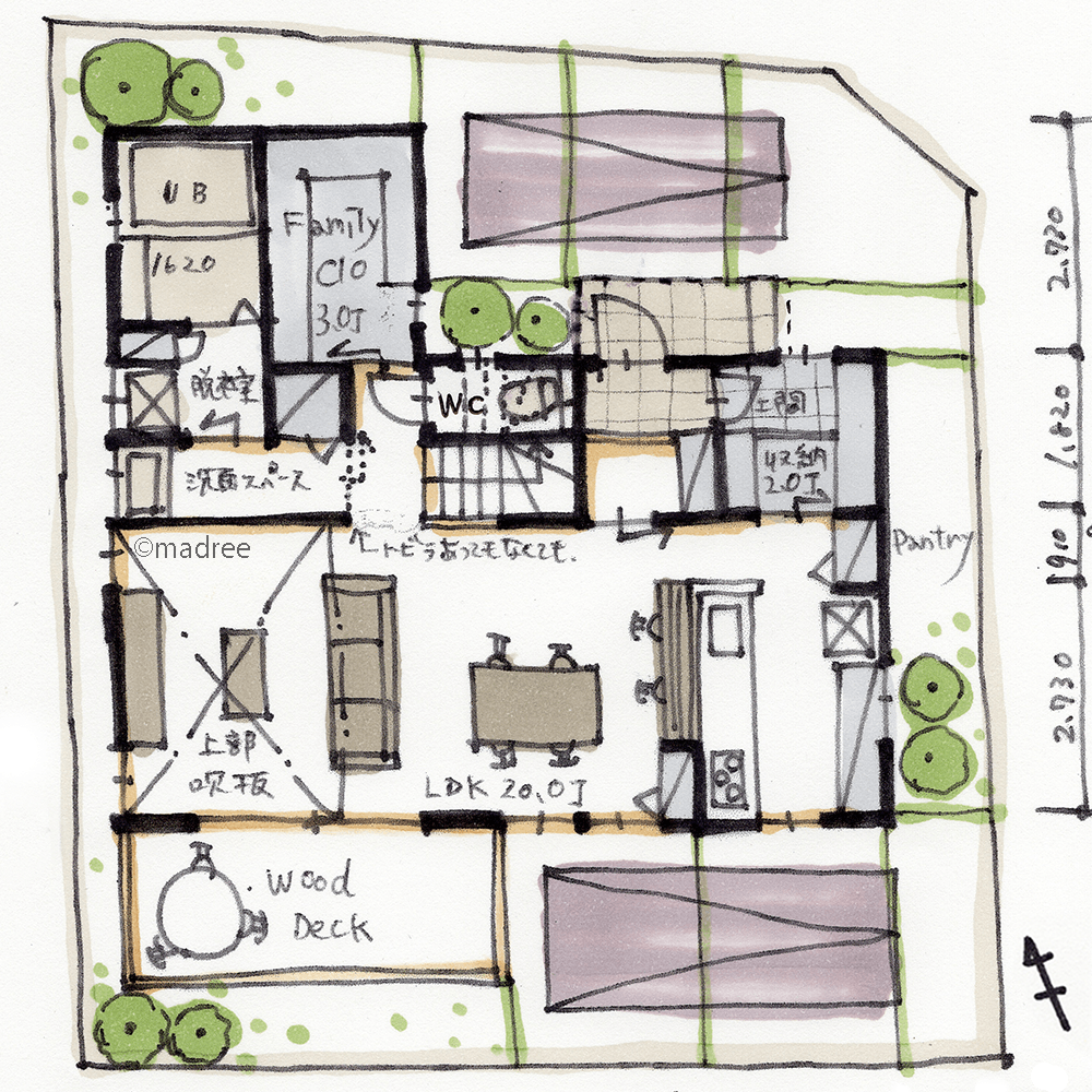 全国の建築家から間取りが集まるmadree(マドリー)で集まった33坪、3LDKの間取りです。外とつながるLDKやアウトドアリビングが特徴の注文住宅の間取りです。