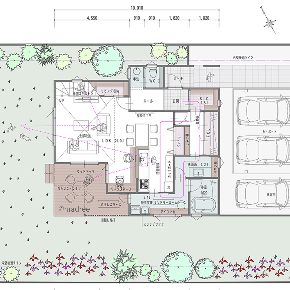全国の建築家から間取りが集まるmadree(マドリー)で集まった39坪、4LDKの間取りです。外とつながるLDKやアウトドアリビングが特徴の注文住宅の間取りです。