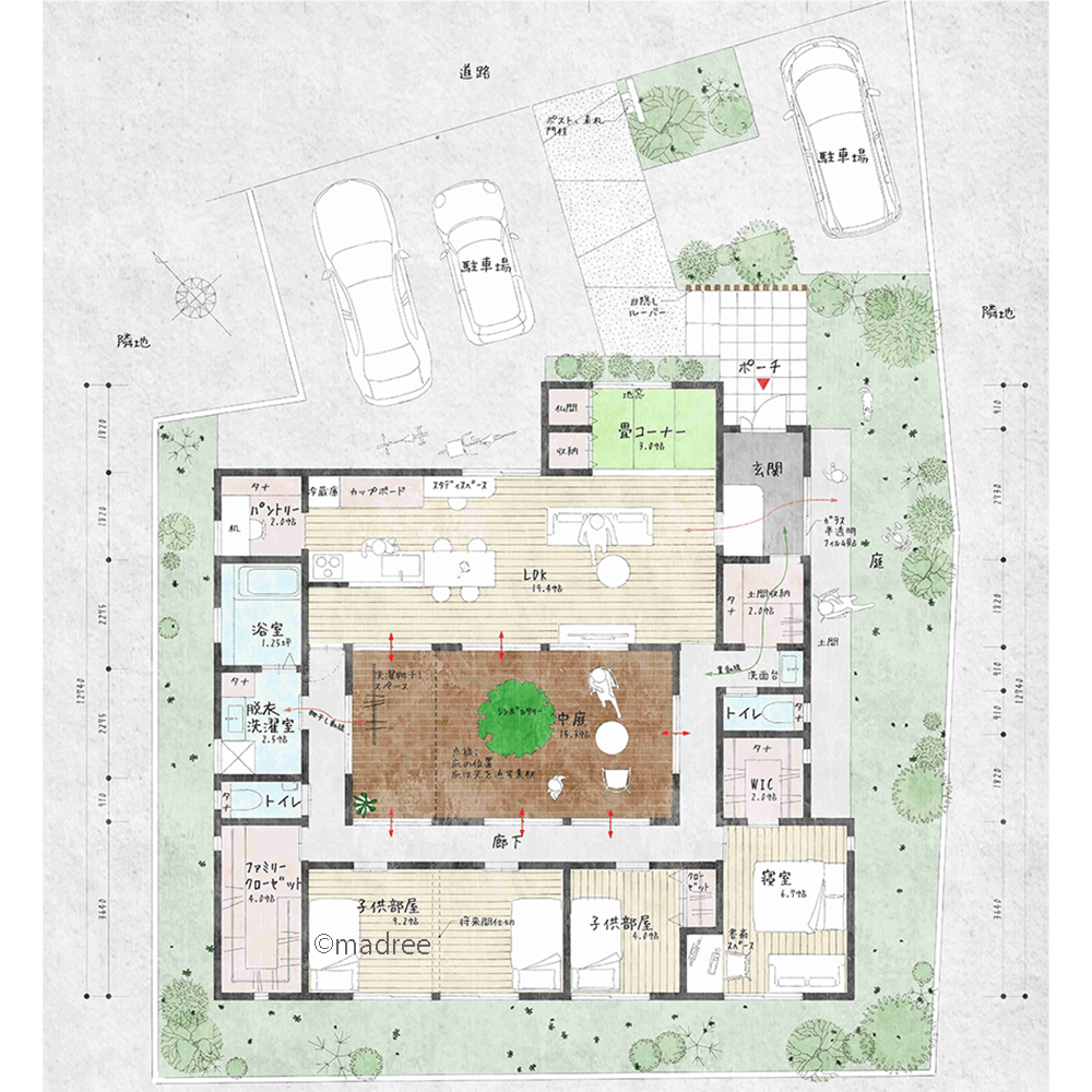 ・北側を駐車場、建物を南に寄せる配置としました。そして建物中央を中庭にし、リビングから中庭へとアクセスできるようになっています。