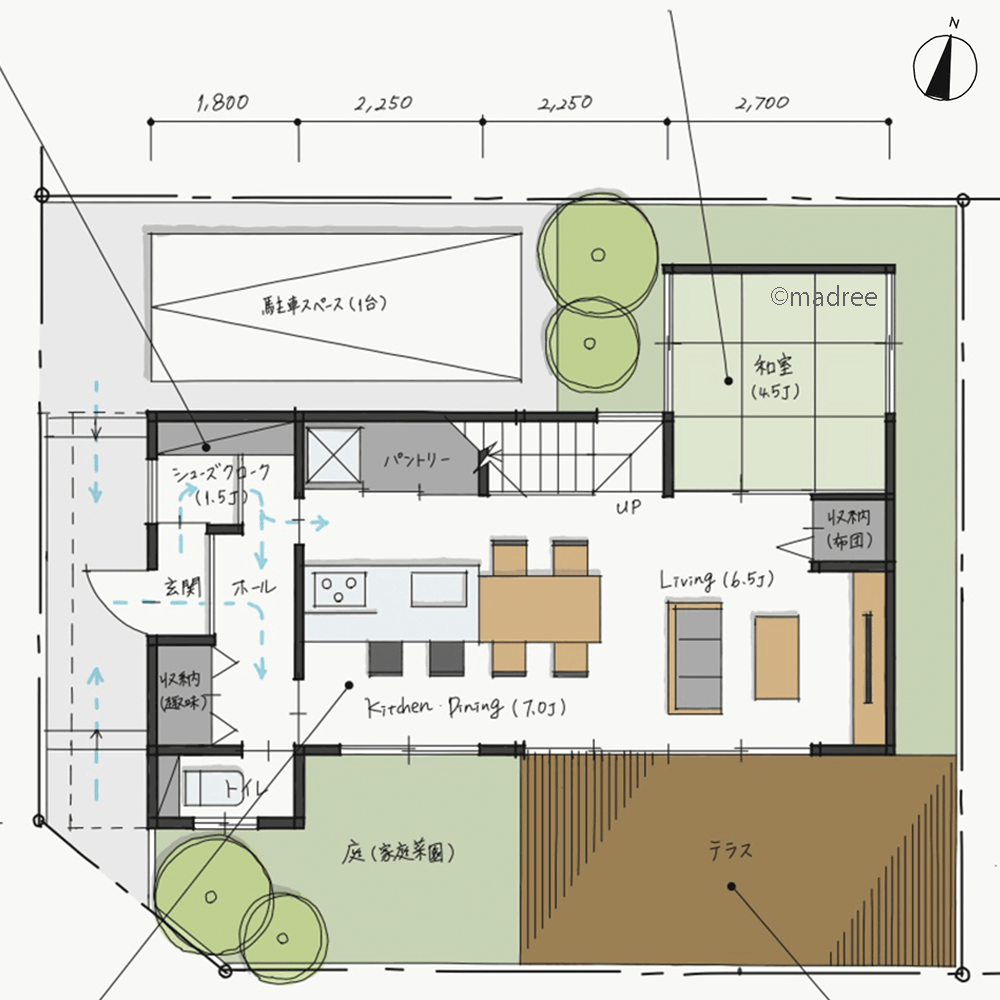 ・北側に駐車スペースを確保し、建物を挟んで南側一帯が庭やテラスとなるように計画しています。
