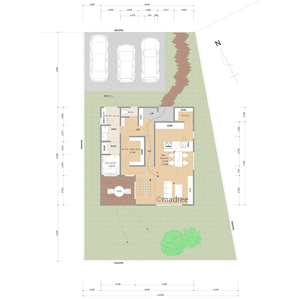 全国の建築家から間取りが集まるmadree(マドリー)で集まった41坪、3LDKの間取りです。外とつながるLDKやアウトドアリビングが特徴の注文住宅の間取りです。