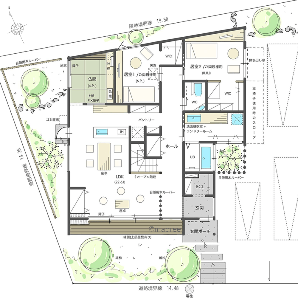・洗濯脱衣室&ランドリールーム:洗濯→干す→たたむといった一連の作業が一箇所で完結できるようにしました。また南側の坪庭をバルコニーに変更しても良いかと思います。
