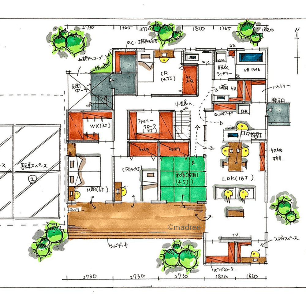 全国の建築家から間取りが集まるmadree(マドリー)で集まった34坪、4LDKの間取りです。外とつながるLDKやアウトドアリビングが特徴の注文住宅の間取りです。