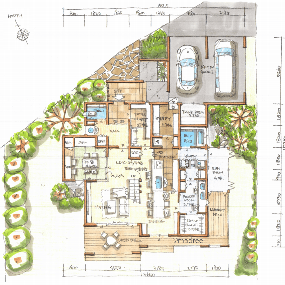 全国の建築家から間取りが集まるmadree(マドリー)で集まった50坪以上、4LDKの間取りです。外とつながるLDKやアウトドアリビングが特徴の注文住宅の間取りです。