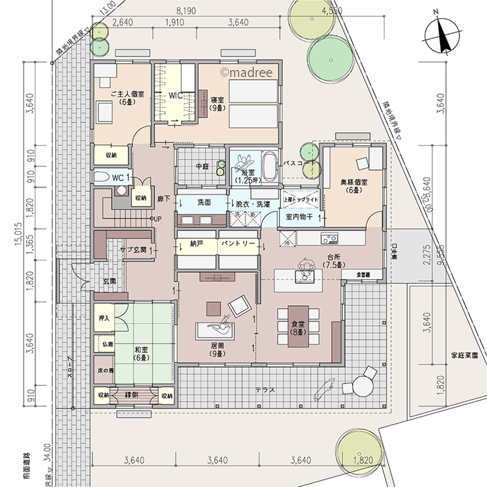 全国の建築家から間取りが集まるmadree(マドリー)で集まった50坪以上、6LDKの間取りです。外とつながるLDKやアウトドアリビングが特徴の注文住宅の間取りです。