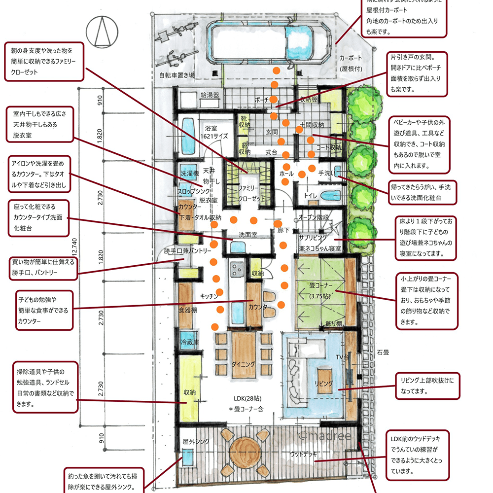 全国の建築家から間取りが集まるmadree(マドリー)で集まった45坪、3LDKの間取りです。外とつながるLDKやアウトドアリビングが特徴の注文住宅の間取りです。