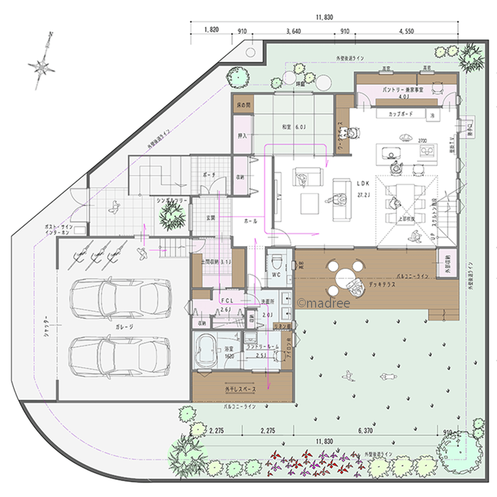 全国の建築家から間取りが集まるmadree(マドリー)で集まった58坪、4LDKの間取りです。外とつながるLDKやアウトドアリビングが特徴の注文住宅の間取りです。