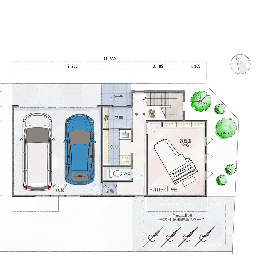 ・2階はできるだけ陽当りが良くなるよう、建物は北側に寄せました。3m程の空地は自転車置場にしていますが、来客用の臨時駐車スペースとしても利用できます。