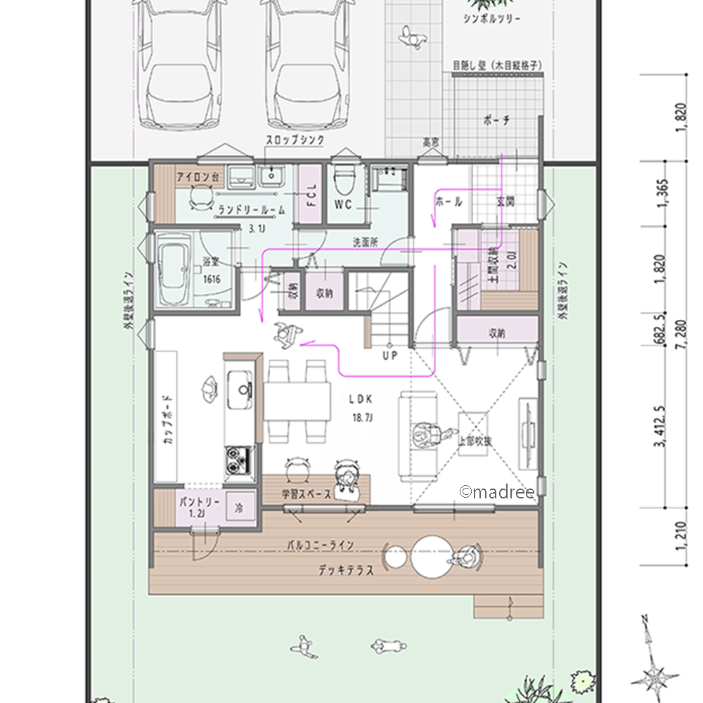 全国の建築家から間取りが集まるmadree(マドリー)で集まった34坪、3LDKの間取りです。外とつながるLDKやアウトドアリビングが特徴の注文住宅の間取りです。