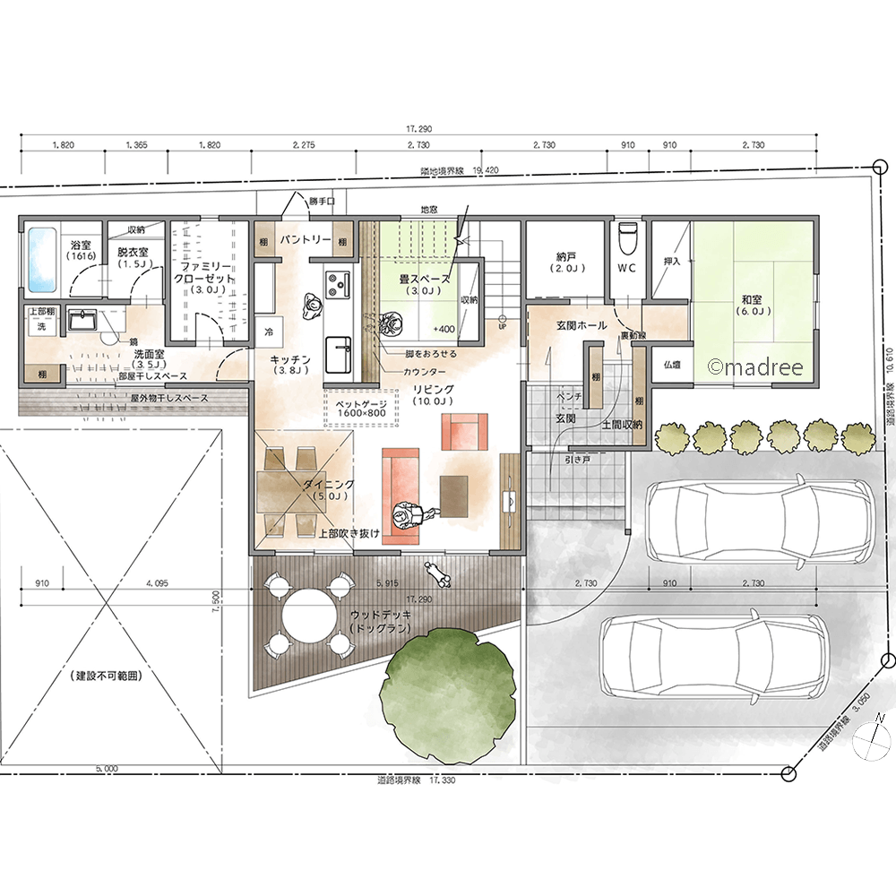 [38坪 3LDK] 愛犬と一緒にアウトドア楽しむ、将来同居を見据えた二世帯住宅の間取り