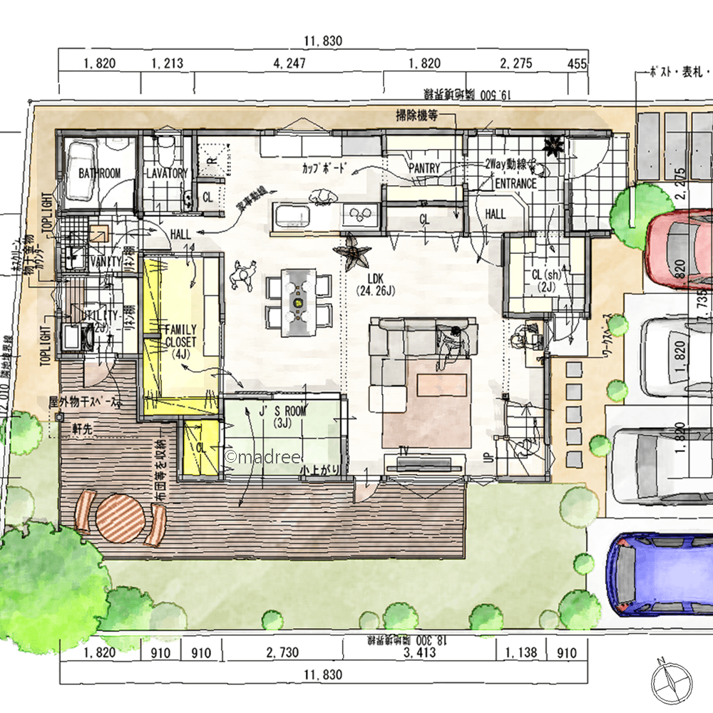 全国の建築家から間取りが集まるmadree(マドリー)で集まった39坪、2LDKの間取りです。外とつながるLDKやアウトドアリビングが特徴の注文住宅の間取りです。