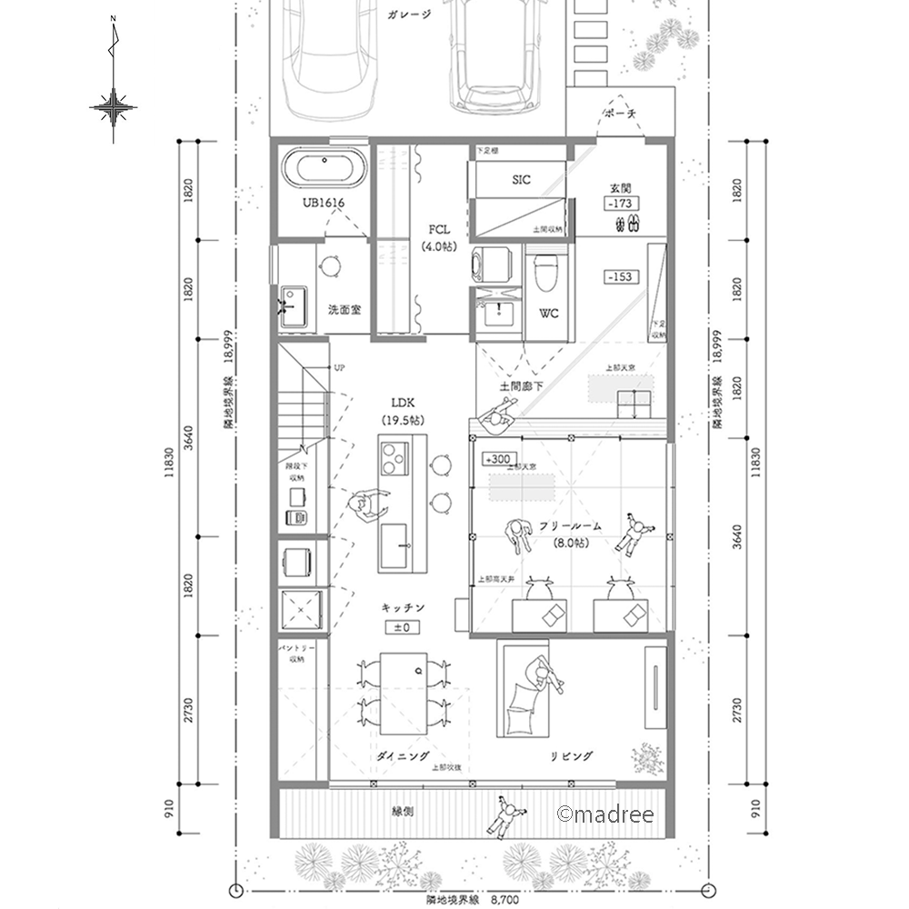 全国の建築家から間取りが集まるmadree(マドリー)で集まった36坪、3LDKの間取りです。外とつながるLDKやダイニング吹抜が特徴の注文住宅の間取りです。