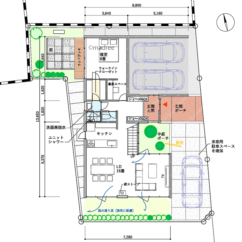 ・玄関土間を大きくし、正面とガレージからアクセスできようにしました。