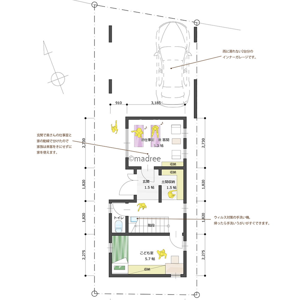 全国の建築家から間取りが集まるmadree(マドリー)で集まった25坪、4LDKの間取りです。広く感じるLDKやプライバシー守るが特徴の注文住宅の間取りです。