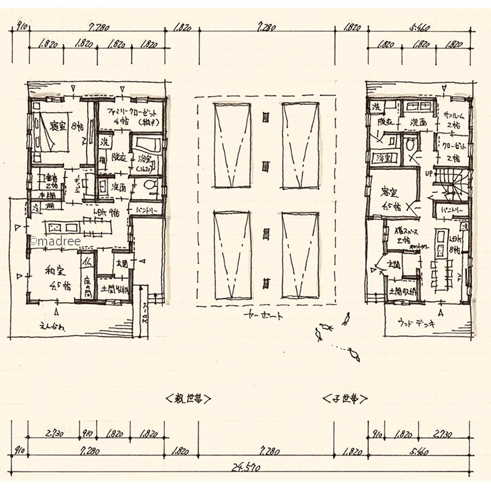 全国の建築家から間取りが集まるmadree(マドリー)で集まった45坪、6LDKの間取りです。外とつながるLDKやアウトドアリビングが特徴の注文住宅の間取りです。