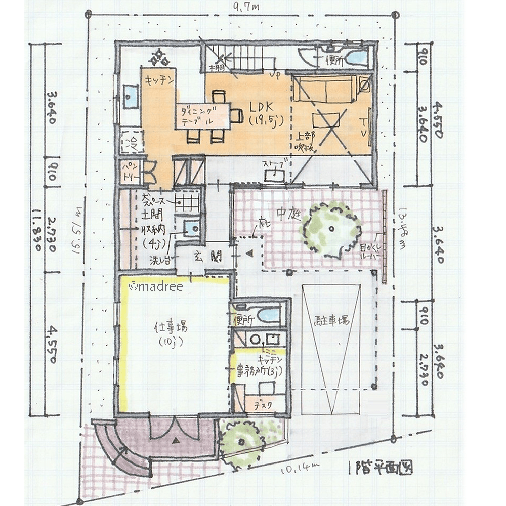 全国の建築家から間取りが集まるmadree(マドリー)で集まった38坪、4LDKの間取りです。外とつながるLDKやアウトドアリビングが特徴の注文住宅の間取りです。