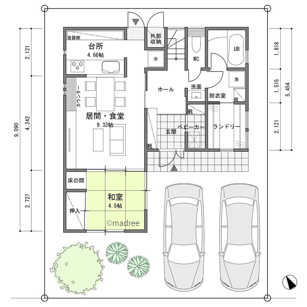 全国の建築家から間取りが集まるmadree(マドリー)で集まった31坪、3LDKの間取りです。リビング一体の畳や床の間が特徴の注文住宅の間取りです。