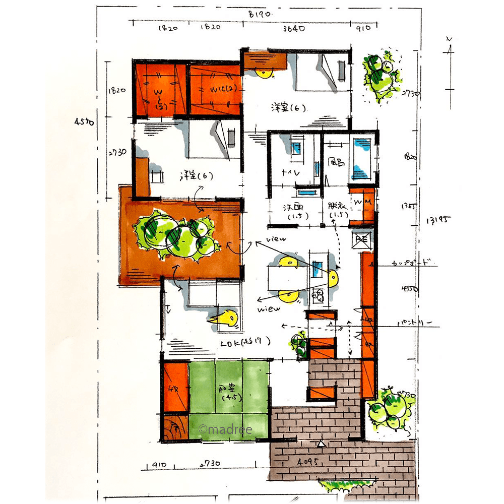 ・LDKと洋室で囲むように、コの字部分にウッドデッキを配置しました。家のどこからも眺める事ができます。
