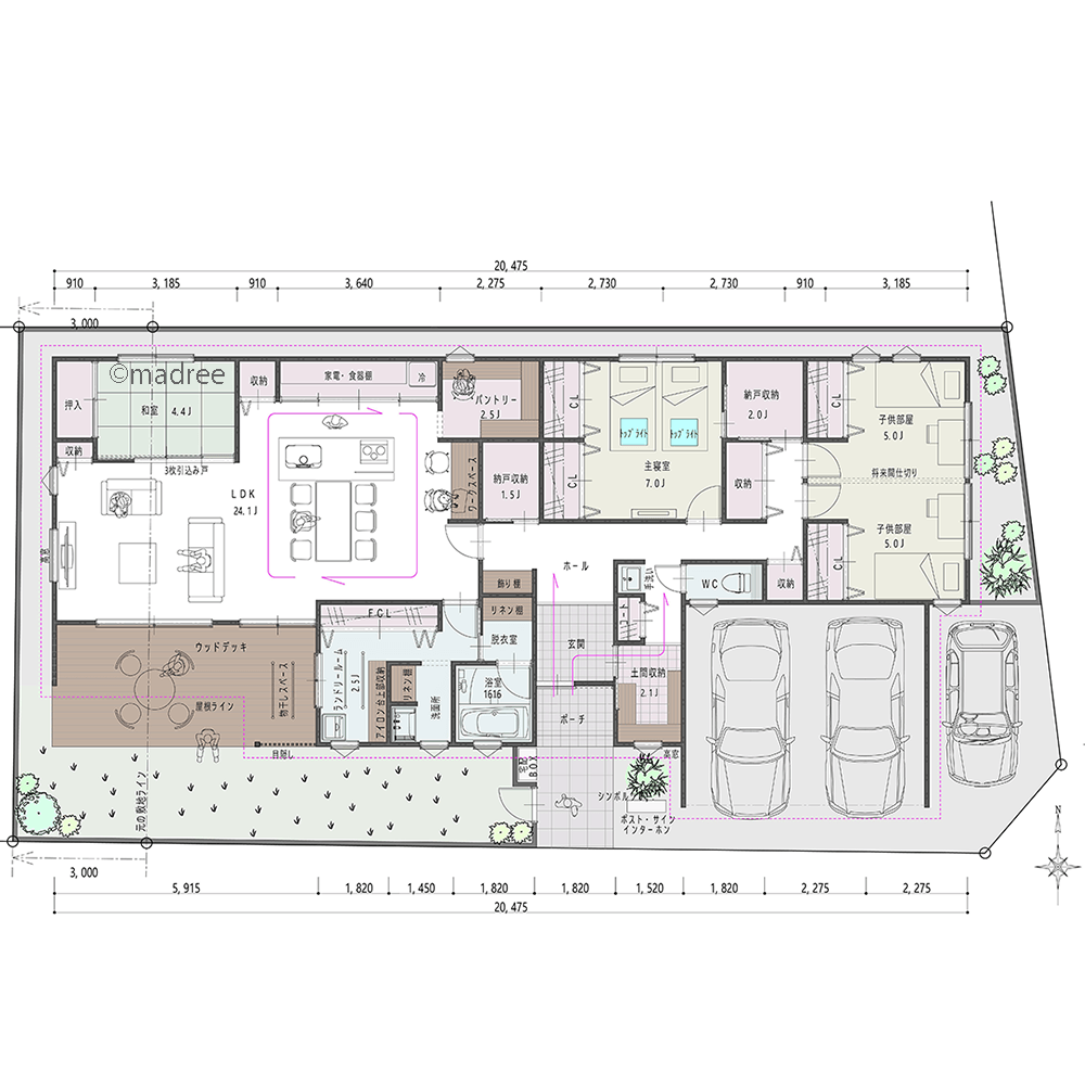・洗濯動線を一カ所に集め、ランドリールームから直接外干しスペースに出られるようにしました。
