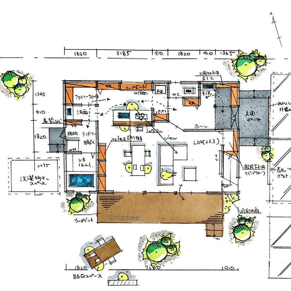 全国の建築家から間取りが集まるmadree(マドリー)で集まった37坪、3LDKの間取りです。外とつながるLDKやアウトドアリビングが特徴の注文住宅の間取りです。