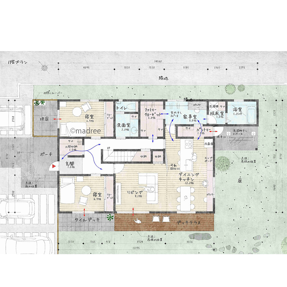 全国の建築家から間取りが集まるmadree(マドリー)で集まった50坪、5LDKの間取りです。外とつながるLDKやアウトドアリビングが特徴の注文住宅の間取りです。