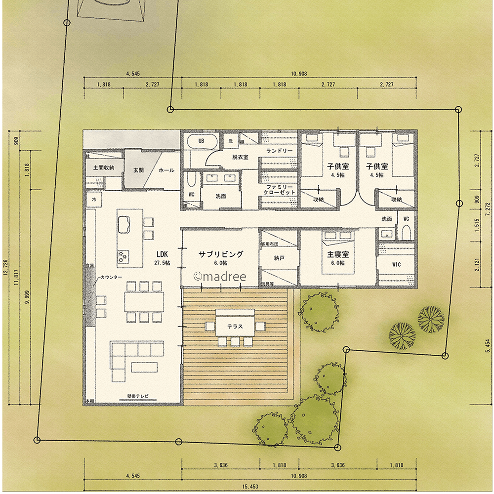 全国の建築家から間取りが集まるmadree(マドリー)で集まった40坪、4LDKの間取りです。外とつながるLDKやアウトドアリビングが特徴の注文住宅の間取りです。