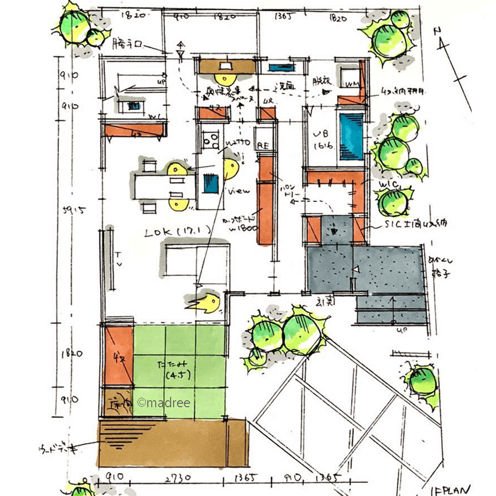 全国の建築家から間取りが集まるmadree(マドリー)で集まった34坪、3LDKの間取りです。外とつながるLDKやアウトドアリビングが特徴の注文住宅の間取りです。