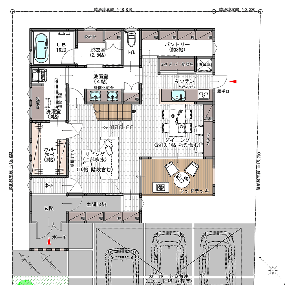 ・3台分の自動車を駐車ができるよう建物を配置し、カーポートを想定しています。