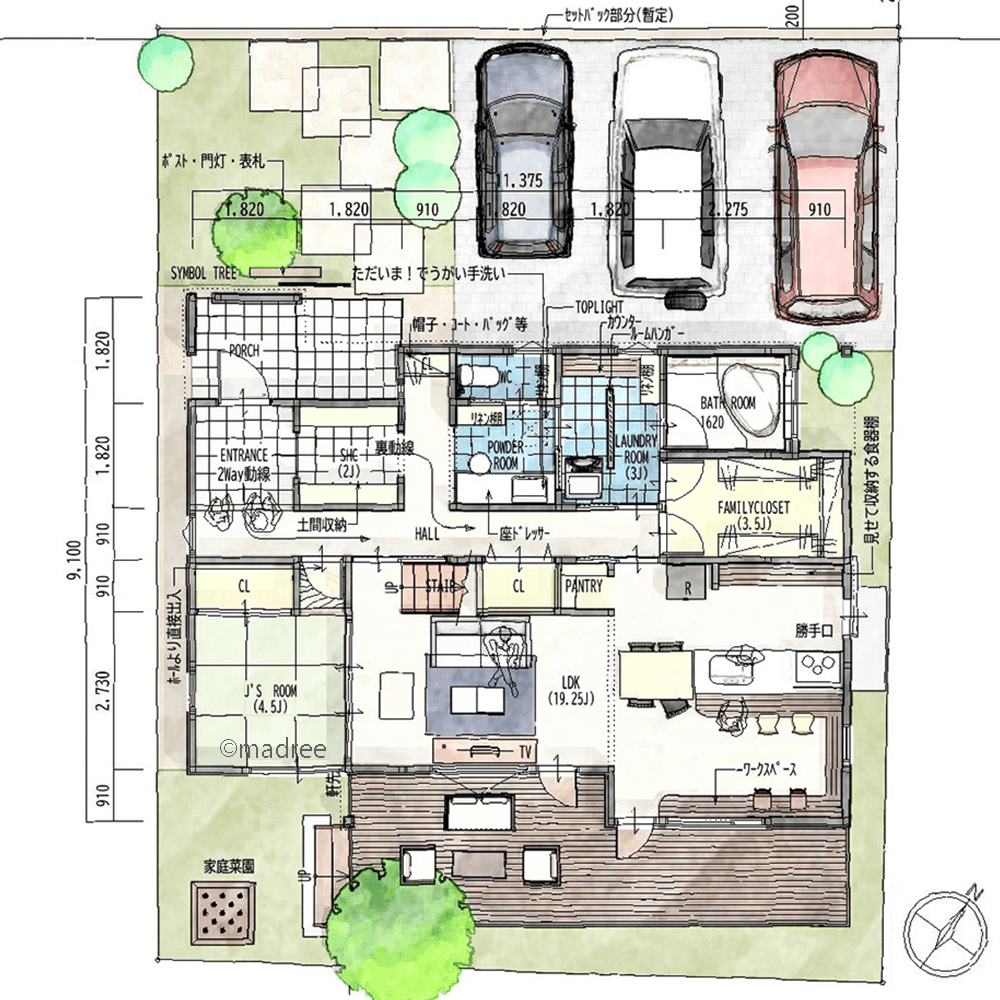 全国の建築家から間取りが集まるmadree(マドリー)で集まった42坪、3LDKの間取りです。外とつながるLDKやアウトドアリビングが特徴の注文住宅の間取りです。