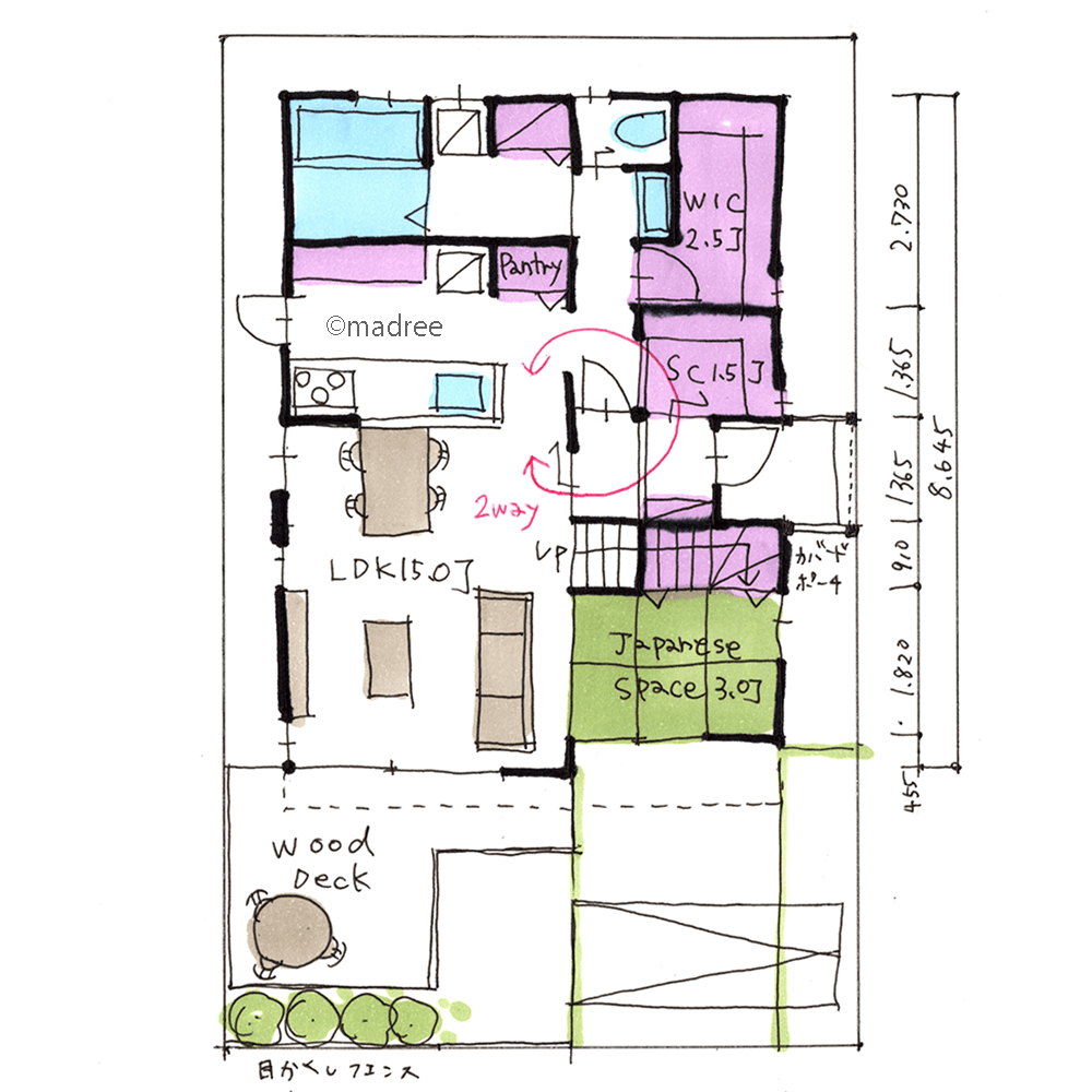 全国の建築家から間取りが集まるmadree(マドリー)で集まった31坪、4LDKの間取りです。外とつながるLDKやアウトドアリビングが特徴の注文住宅の間取りです。
