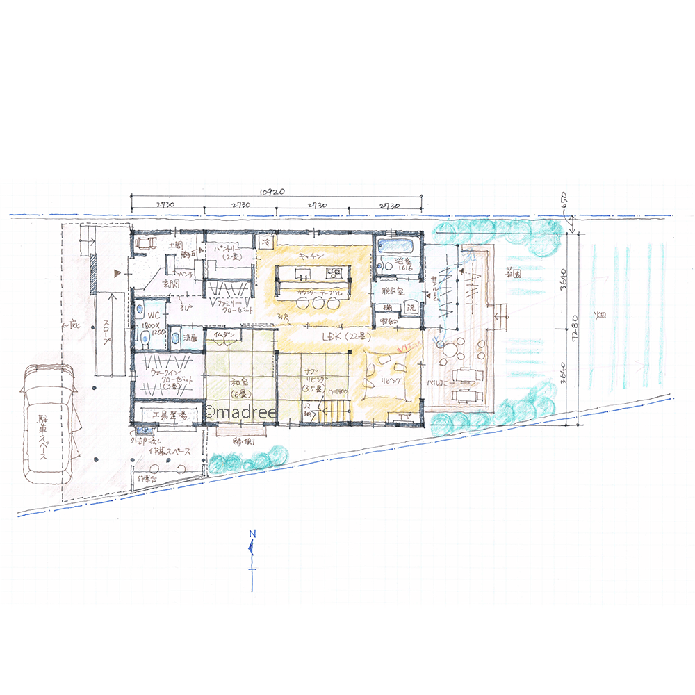 全国の建築家から間取りが集まるmadree(マドリー)で集まった41坪、4LDKの間取りです。外とつながるLDKやアウトドアリビングが特徴の注文住宅の間取りです。