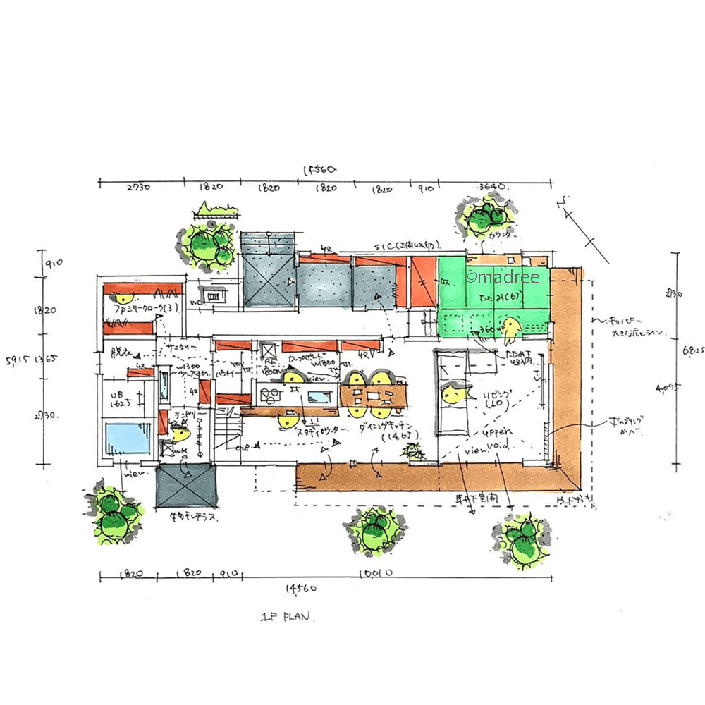 全国の建築家から間取りが集まるmadree(マドリー)で集まった53坪、5LDKの間取りです。外とつながるLDKやアウトドアリビングが特徴の注文住宅の間取りです。
