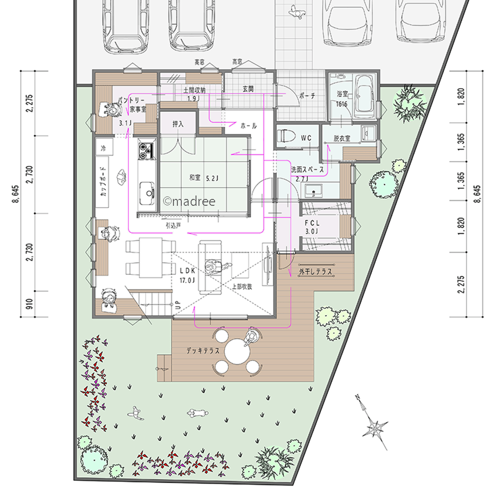 ・脱衣室→洗面→FCL→テラスが繋がっているので、洗う・干す・収納がしやすい家事ラク動線としています。