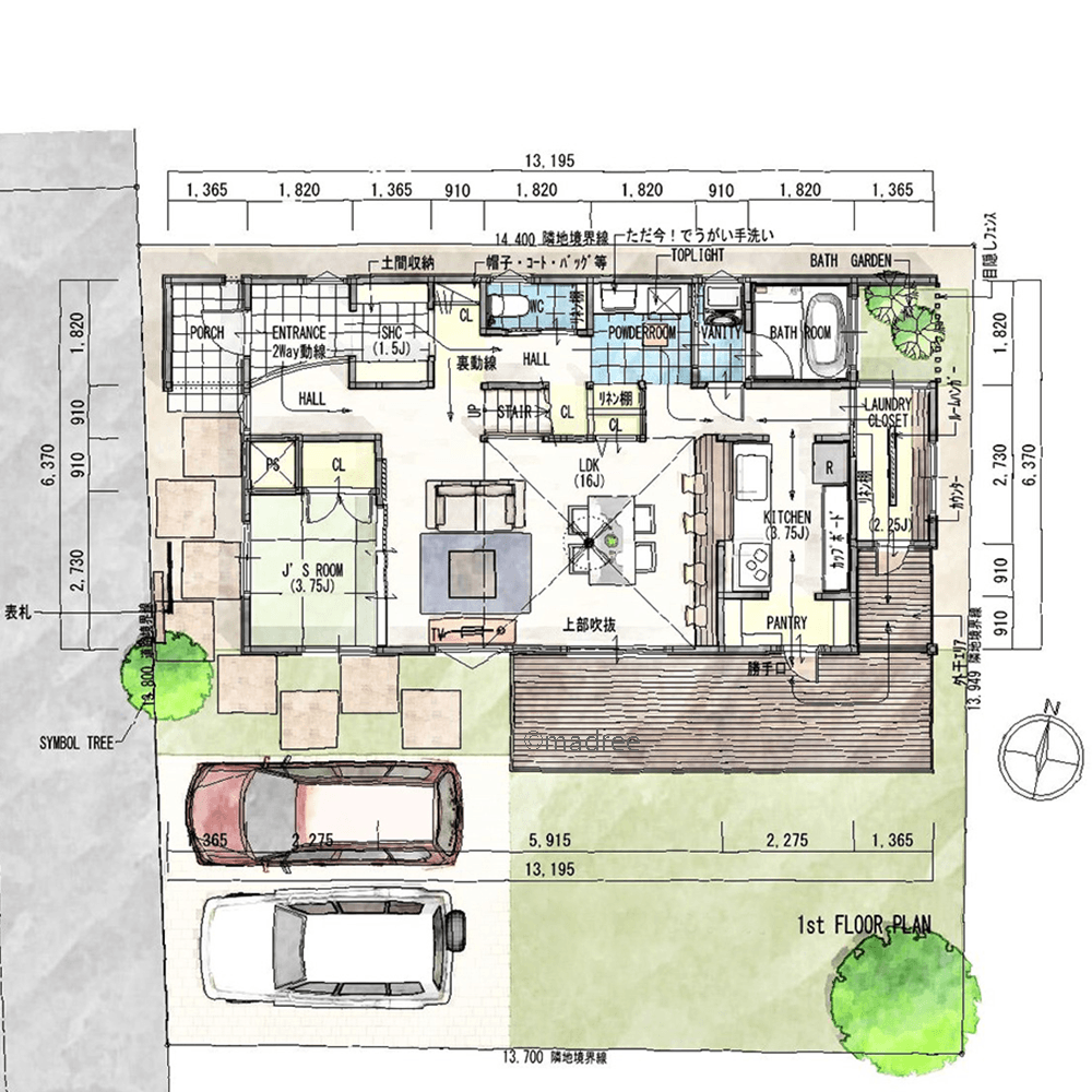 全国の建築家から間取りが集まるmadree(マドリー)で集まった37坪、4LDKの間取りです。外とつながるLDKやアウトドアリビングが特徴の注文住宅の間取りです。