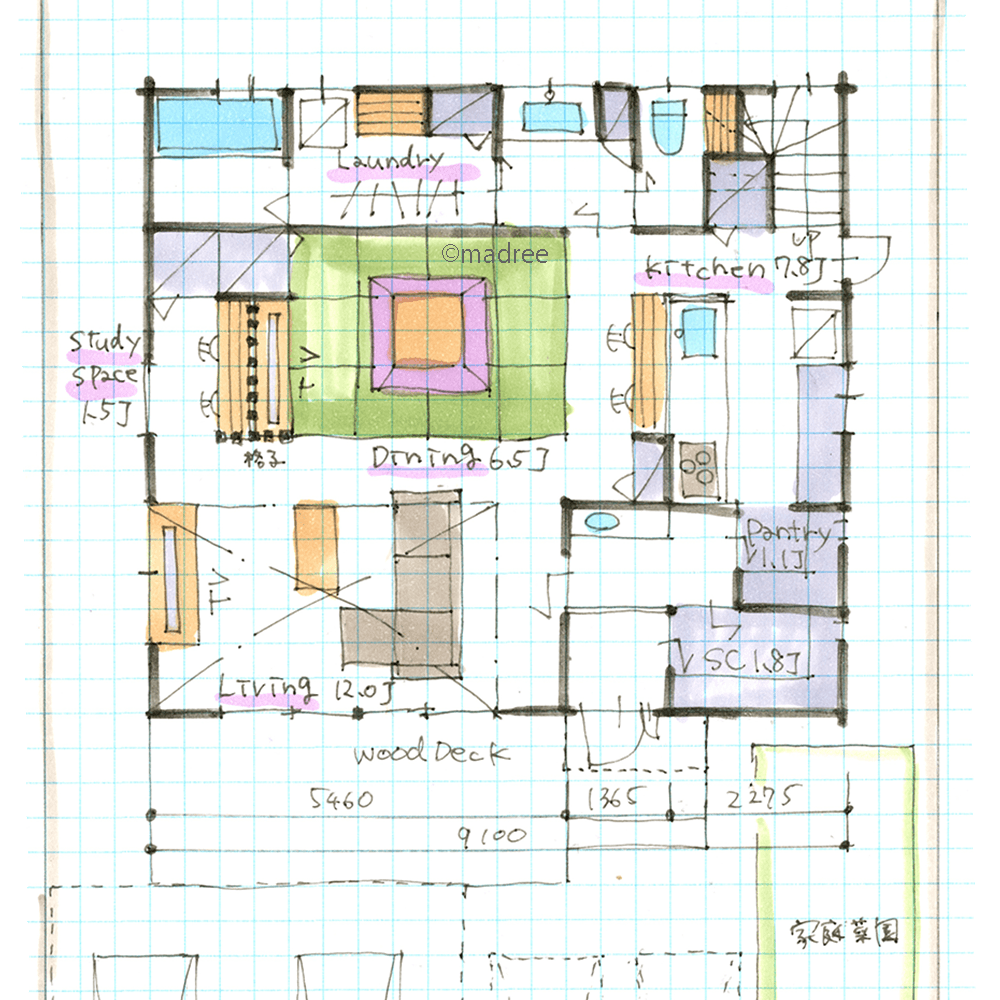 全国の建築家から間取りが集まるmadree(マドリー)で集まった39坪、2LDKの間取りです。外とつながるLDKやアウトドアリビングが特徴の注文住宅の間取りです。