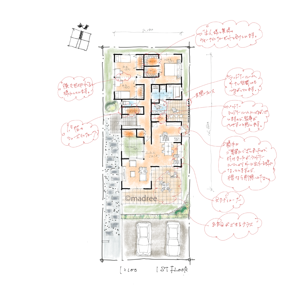 ご要望に沿うように計画したつもりですが、文面からするともう少し収納空間が欲しいのかなと感じました。 しかしながら、先述しましたように今回は面積の上限を合わせた形としました。