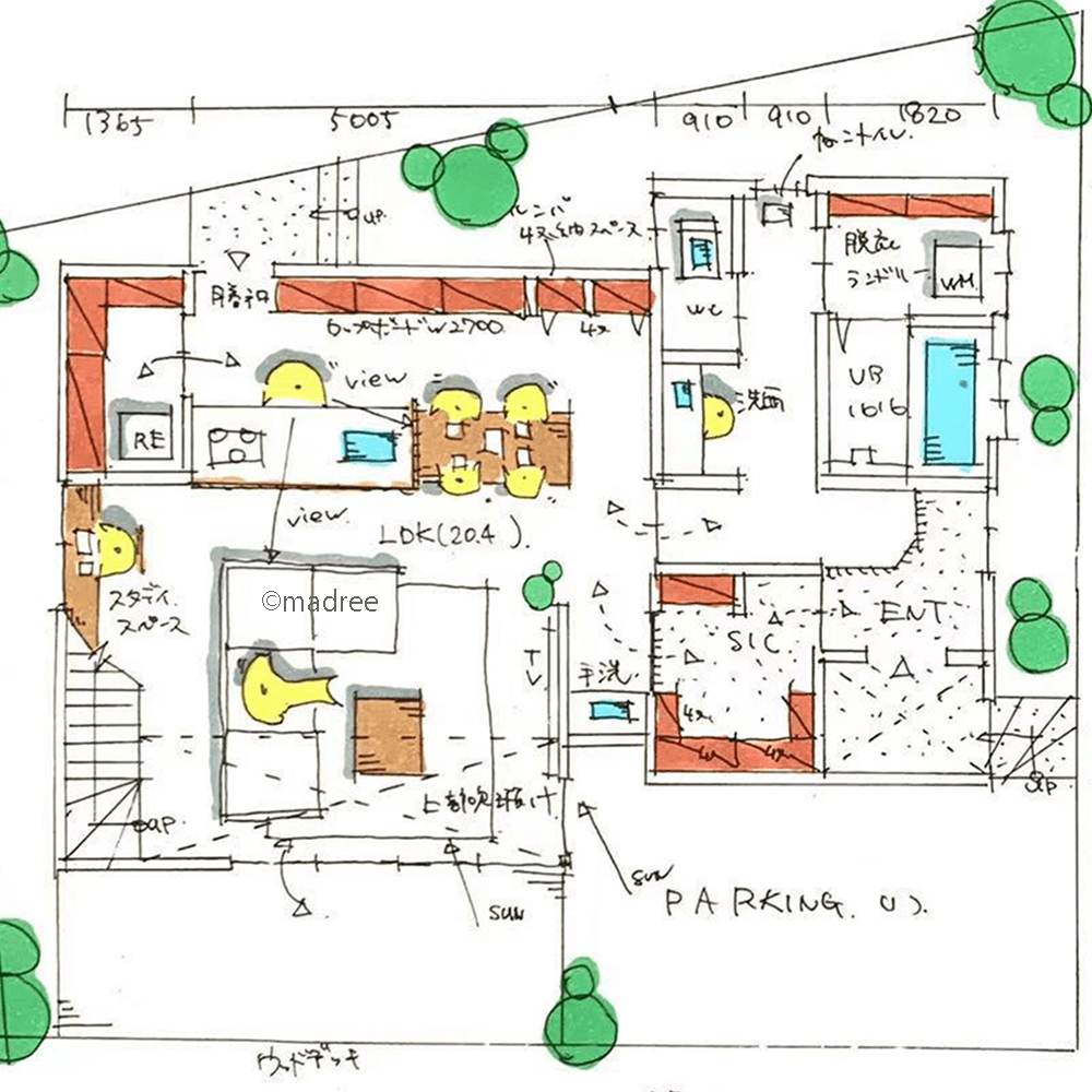 全国の建築家から間取りが集まるmadree(マドリー)で集まった34坪、3LDKの間取りです。外とつながるLDKやアウトドアリビングが特徴の注文住宅の間取りです。