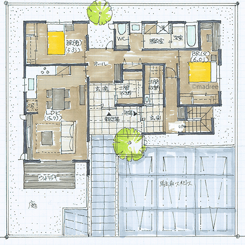 全国の建築家から間取りが集まるmadree(マドリー)で集まった52坪、5LDKの間取りです。外とつながるLDKや広く感じるLDKが特徴の注文住宅の間取りです。