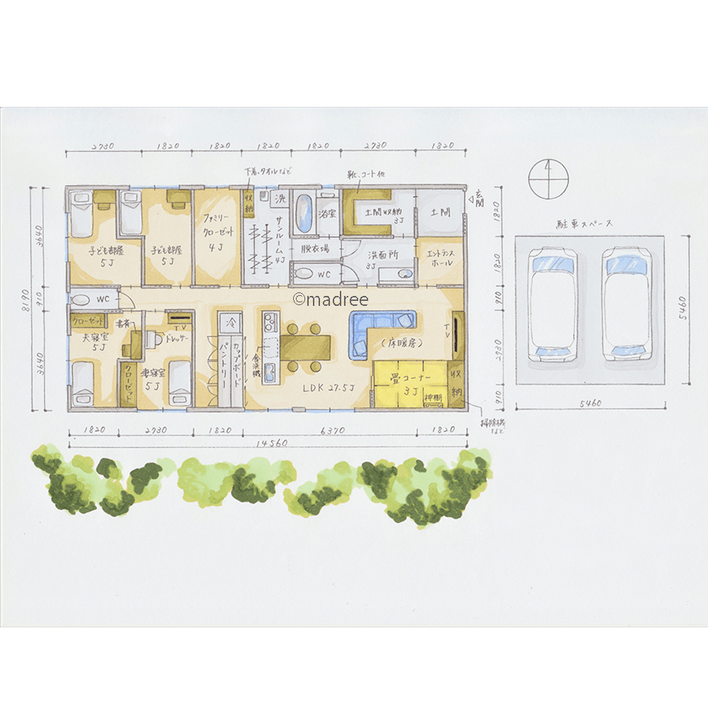 全国の建築家から間取りが集まるmadree(マドリー)で集まった36坪、4LDKの間取りです。広く感じるLDKやL+DKが特徴の注文住宅の間取りです。