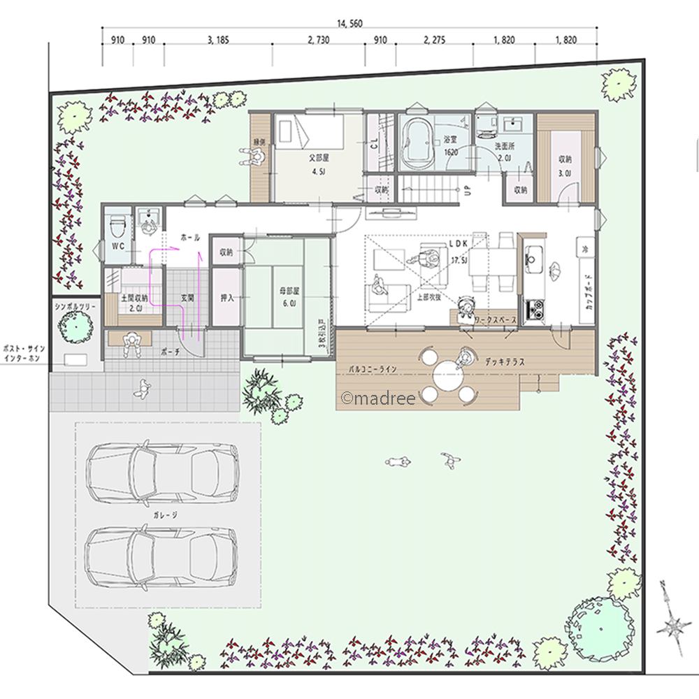 ・ガレージは南西側にプランしました。LDKへの陽当たりや玄関へのアクセスを考えるとこちらの方が良いかと思います。