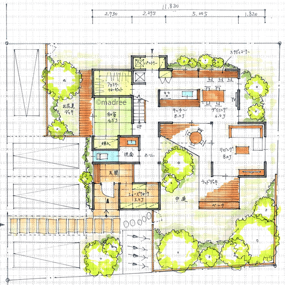 全国の建築家から間取りが集まるmadree(マドリー)で集まった39坪、3LDKの間取りです。外とつながるLDKやアウトドアリビングが特徴の注文住宅の間取りです。