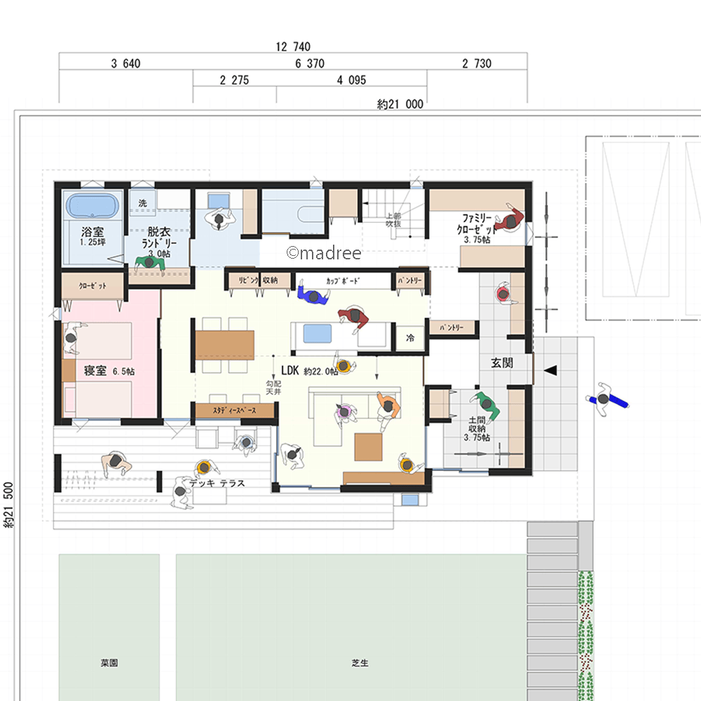 全国の建築家から間取りが集まるmadree(マドリー)で集まった36坪、2LDKの間取りです。外とつながるLDKやアウトドアリビングが特徴の注文住宅の間取りです。