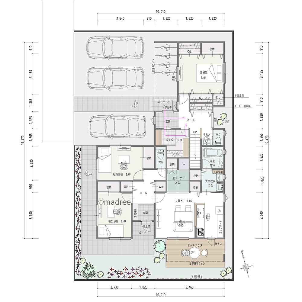 全国の建築家から間取りが集まるmadree(マドリー)で集まった63坪、畳コーナーの間取りです。外とつながるLDKやアウトドアリビングが特徴の注文住宅の間取りです。