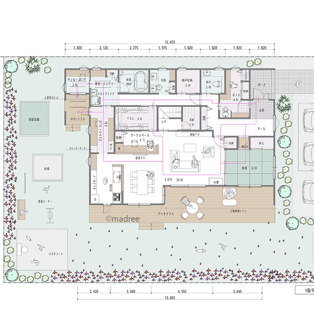 全国の建築家から間取りが集まるmadree(マドリー)で集まった50坪以上、5LDKの間取りです。外とつながるLDKやアウトドアリビングが特徴の注文住宅の間取りです。