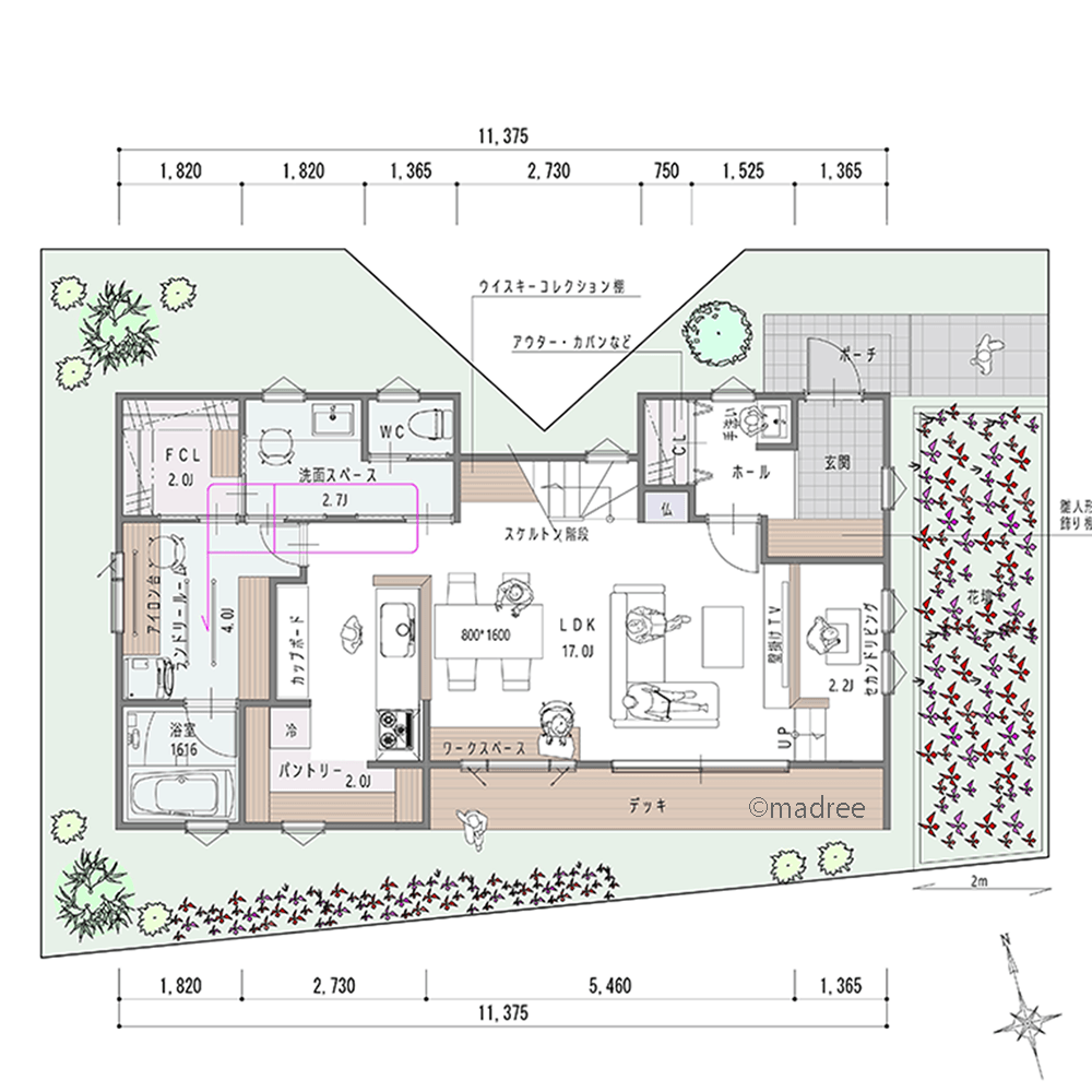 全国の建築家から間取りが集まるmadree(マドリー)で集まった33坪、2LDKの間取りです。外とつながるLDKやアウトドアリビングが特徴の注文住宅の間取りです。