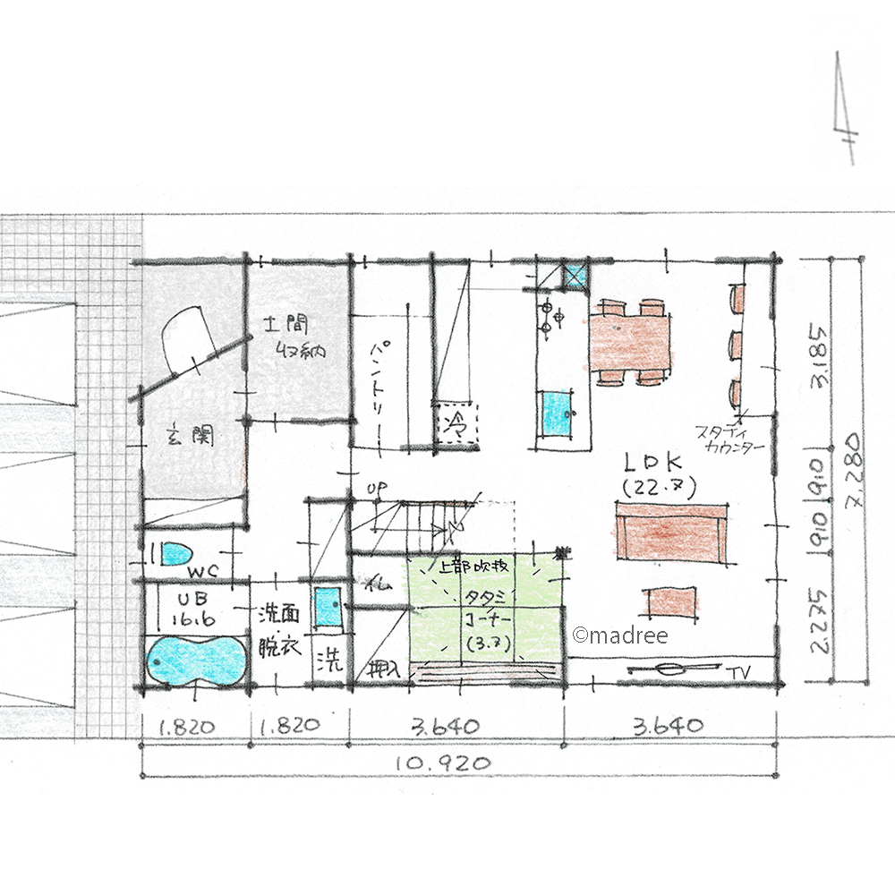全国の建築家から間取りが集まるmadree(マドリー)で集まった36坪、2LDKの間取りです。広く感じるLDKやリビング一体の畳が特徴の注文住宅の間取りです。