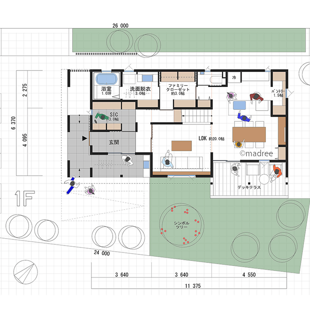 全国の建築家から間取りが集まるmadree(マドリー)で集まった36坪、3LDKの間取りです。外とつながるLDKやアウトドアリビングが特徴の注文住宅の間取りです。