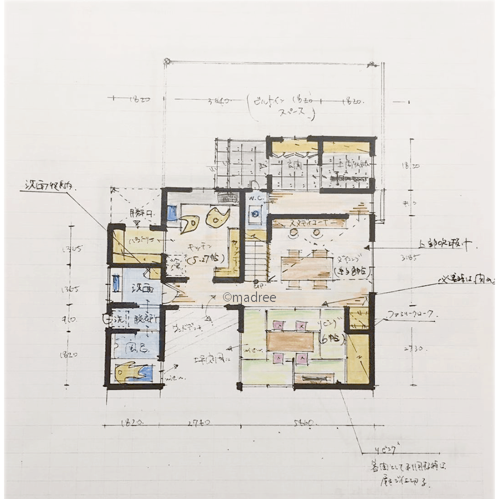 全国の建築家から間取りが集まるmadree(マドリー)で集まった31坪、2LDKの間取りです。外とつながるLDKやアウトドアリビングが特徴の注文住宅の間取りです。
