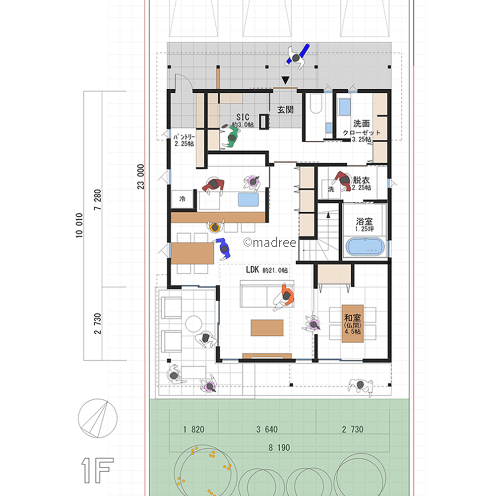 全国の建築家から間取りが集まるmadree(マドリー)で集まった41坪、4LDKの間取りです。外とつながるLDKやアウトドアリビングが特徴の注文住宅の間取りです。